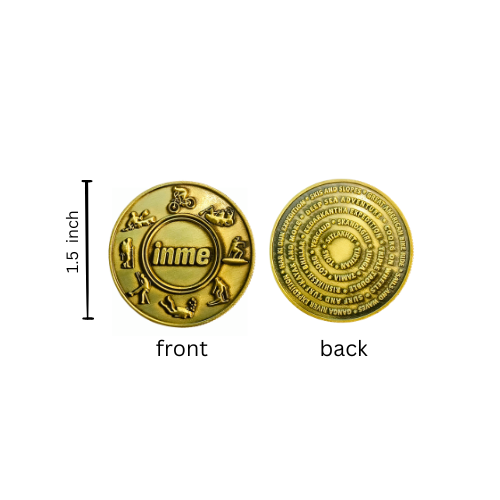 This finely crafted brass-toned coin features embossed icons representing the many adventures Inme stands for—from kayaking and mountain biking to trekking and diving. At the heart of the coin sits the Inme logo, a proud symbol of outdoor spirit, growth, and unforgettable memories.